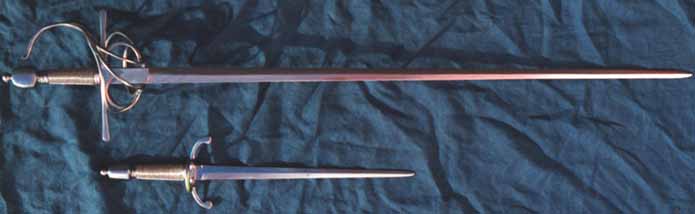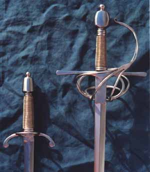 16th/17th Century Swept Hilt Rapier. (Example shown has 37 inch diamond section blade) Left Hand Dagger. Available as sharp or for stage fighting. |